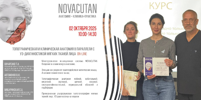 На диссекционном курсе от компании Novacutan участники проработали клиническую и топографическую анатомию зон лица в параллели с УЗ-диагностикой мягких тканей.